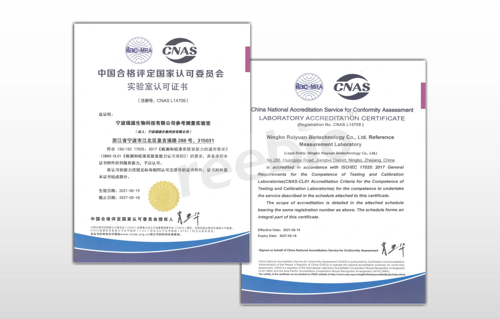 2021年5月19日寧波瑞源生物科技有限公司參考測(cè)量實(shí)驗(yàn)室(以下簡(jiǎn)稱瑞源生物參考測(cè)量實(shí)驗(yàn)室)獲得中國合格評(píng)定國家認(rèn)可委員會(huì)(CNAS)頒發(fā)的實(shí)驗(yàn)室認(rèn)可證書。